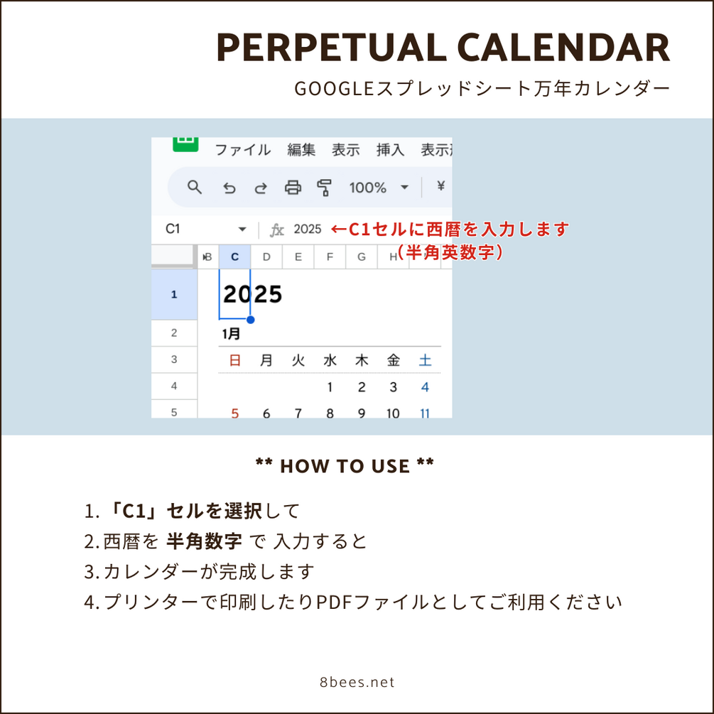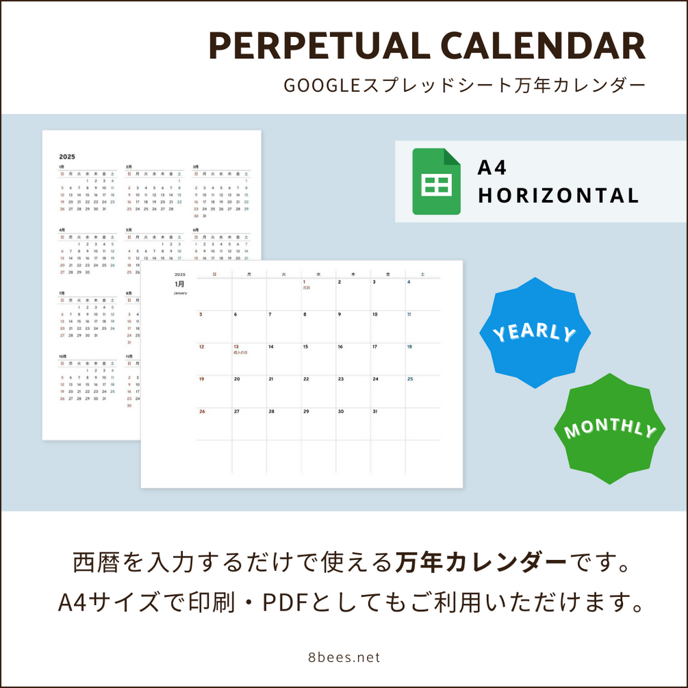 【A4サイズ】Googleスプレッドシート 万年カレンダー(月間)